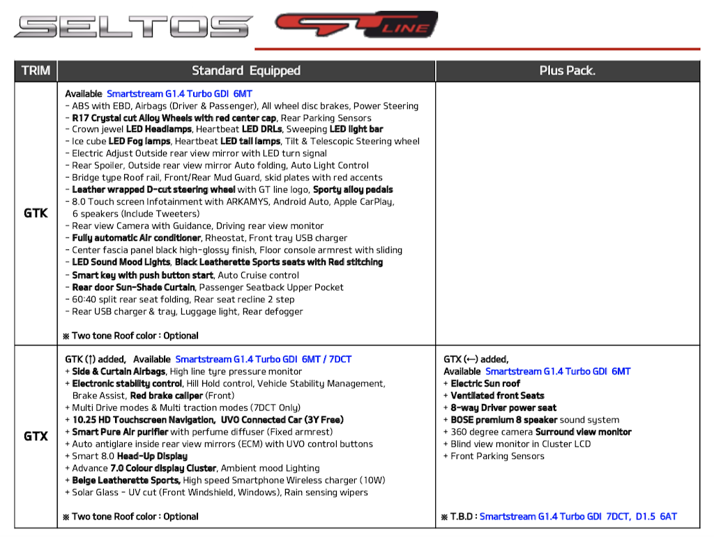 There are 3 variants in tech line the E, K and X and two in the GT line, the K and X for now. There are also the normal and the plus versions with few features extra in each version. I will include a link to the feature list PDF here in this post later, but what you need to observe is the sheer level of combinations of features, engines that Kia is offering which allows them to play in a wide range of price brackets to cater to all audiences.